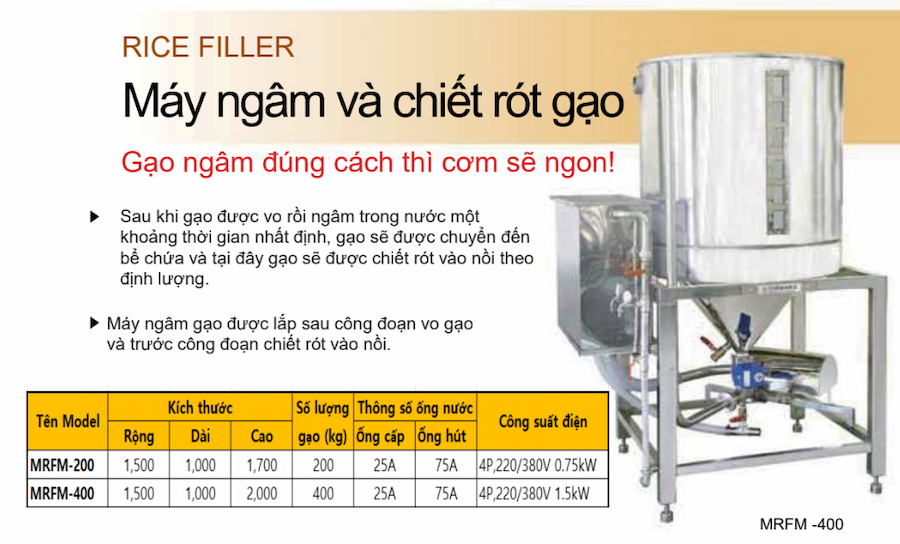 - Máy ngâm gạo được bố trí ngay sau công đoạn vo và trước khi chiết rót, đảm bảo quy trình liên tục và chính xác.