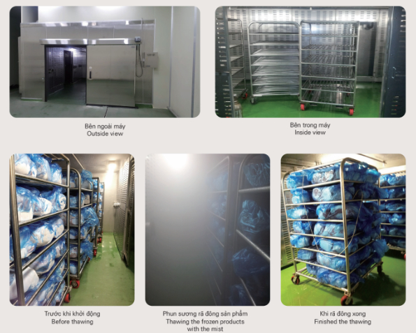 Máy rã đông là một loại thiết bị được sử dụng để rã đông thực phẩm đông lạnh thông qua việc phun hơi nước ấm dưới dạng sương mù. Các loại thực phẩm đông lạnh thường sử dụng hệ thống này như cá hoặc thịt đông lạnh. Hệ thống này cung cấp hơi nước dưới dạng sương lên các sản phẩm đông lạnh, tạo điều kiện cho sự rã đông đồng đều. Máy có dung tích lớn để có thể xử lý một lượng lớn sản phẩm cùng một lúc. Sau khi rã đông hoàn thành, sản phẩm có thể được chuyển vào bảo quản bằng cách sử dụng chức năng phòng mát của máy.