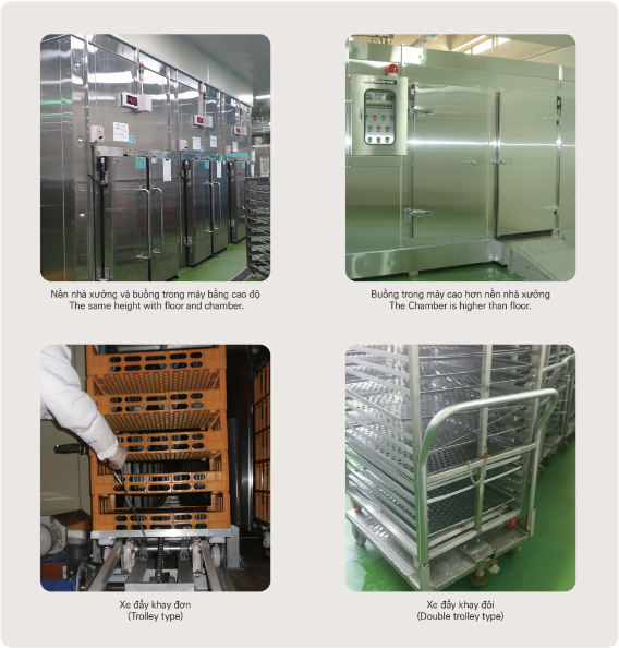 - Sản phẩm được đặt trên các khay, sau đó xếp lên xe đẩy.