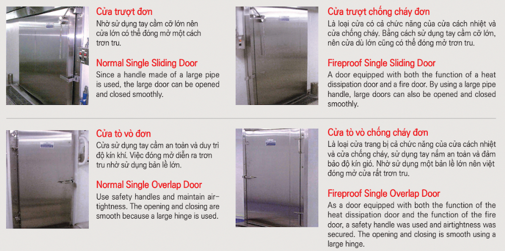 Kho lạnh: Ưu tiên loại cửa có khả năng cách nhiệt tốt, chịu được nhiệt độ thấp (-40°C đến -80°C), vật liệu bền chắc, kín khít.