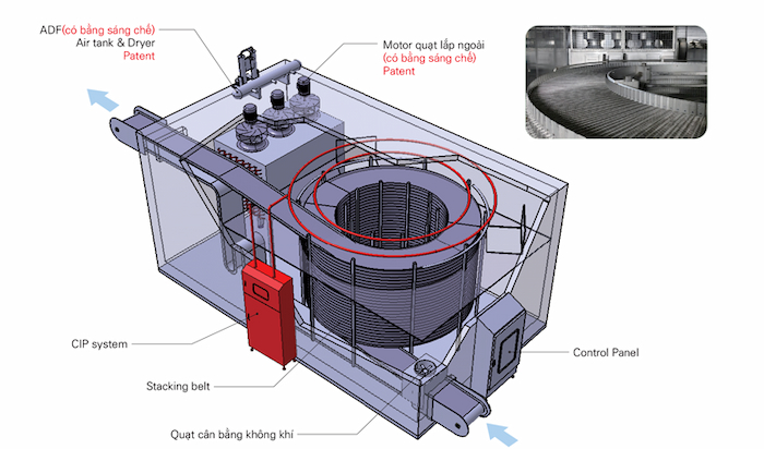 - Nguyên lý: Sản phẩm được xếp chồng lên băng tải và di chuyển theo đường xoắn ốc qua một đường hầm có luồng khí lạnh.